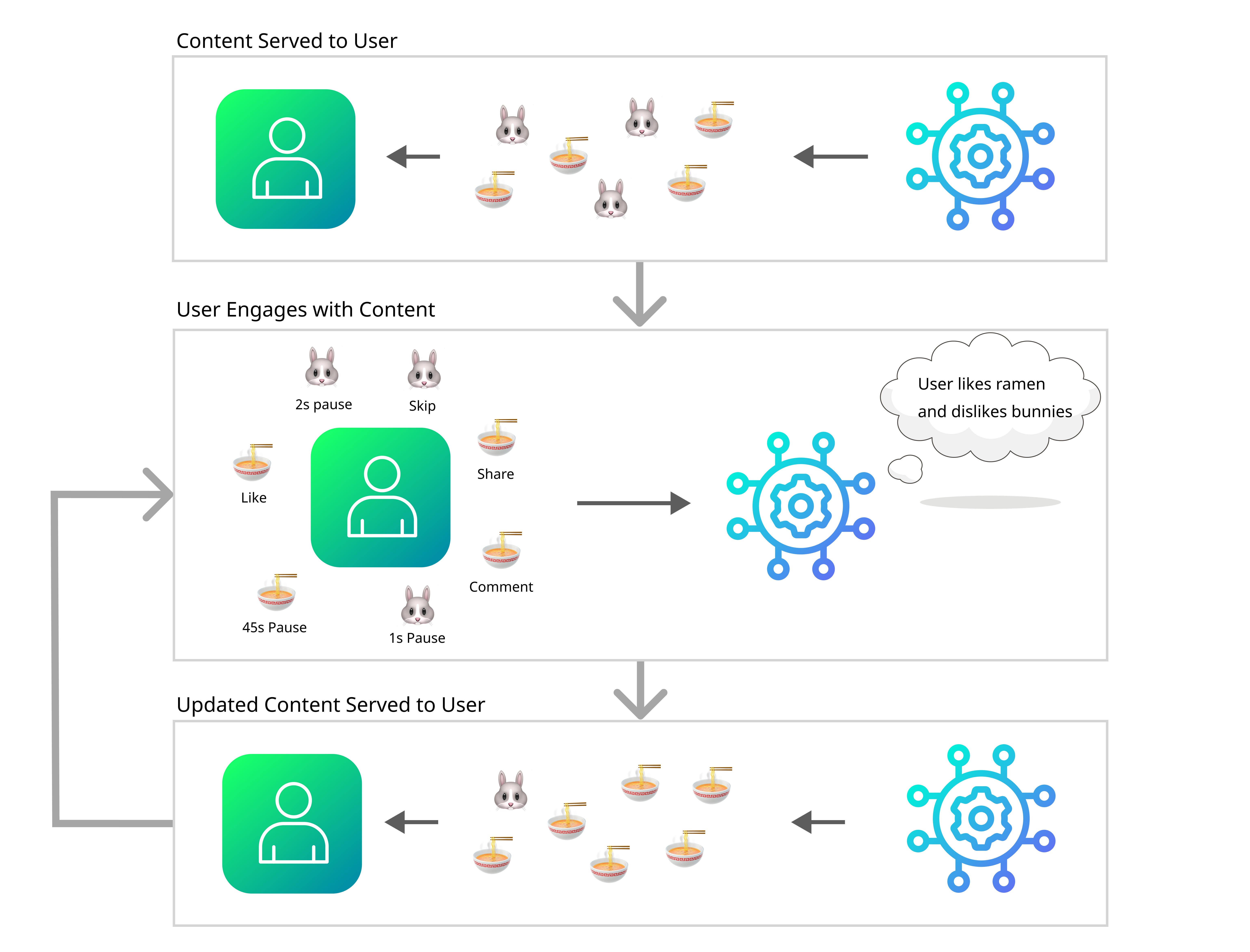 The recommender system then interprets these interactions as signals about your preferences. If you spend 45 seconds watching a cooking video, but scroll quickly past political news, the system registers cooking content as engaging for you.